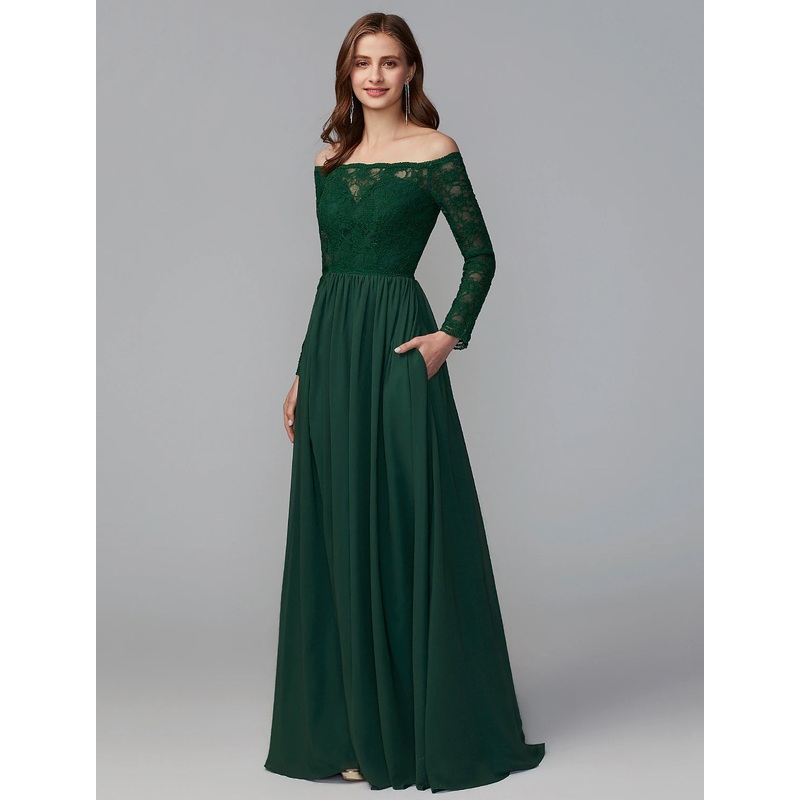 A-Line Bridesmaid Dress Off Shoulder Long Sleeve Elegant Floor Length Chiffon / Lace with Lace