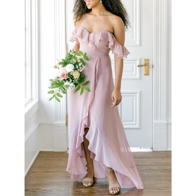 A-Line Bridesmaid Dress Off Shoulder Short Sleeve Elegant Asymmetrical Chiffon with Ruffles / Split Front / Ruching