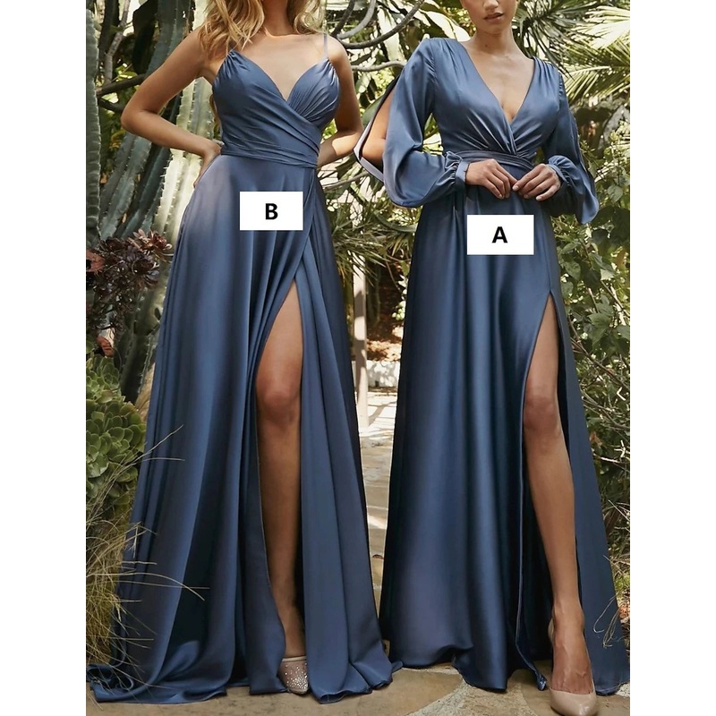 A-Line Bridesmaid Dress V Neck Long Sleeve Blue Floor Length Chiffon with Split Front / Ruching