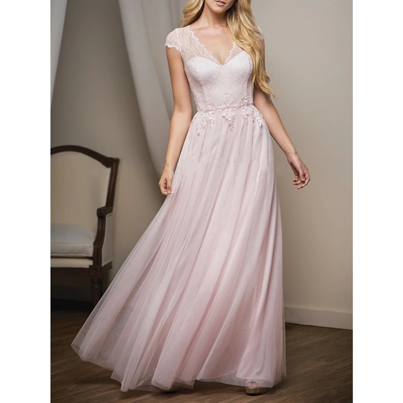 A-Line Bridesmaid Dress V Neck Short Sleeve Elegant Floor Length Tulle with Lace / Ruching