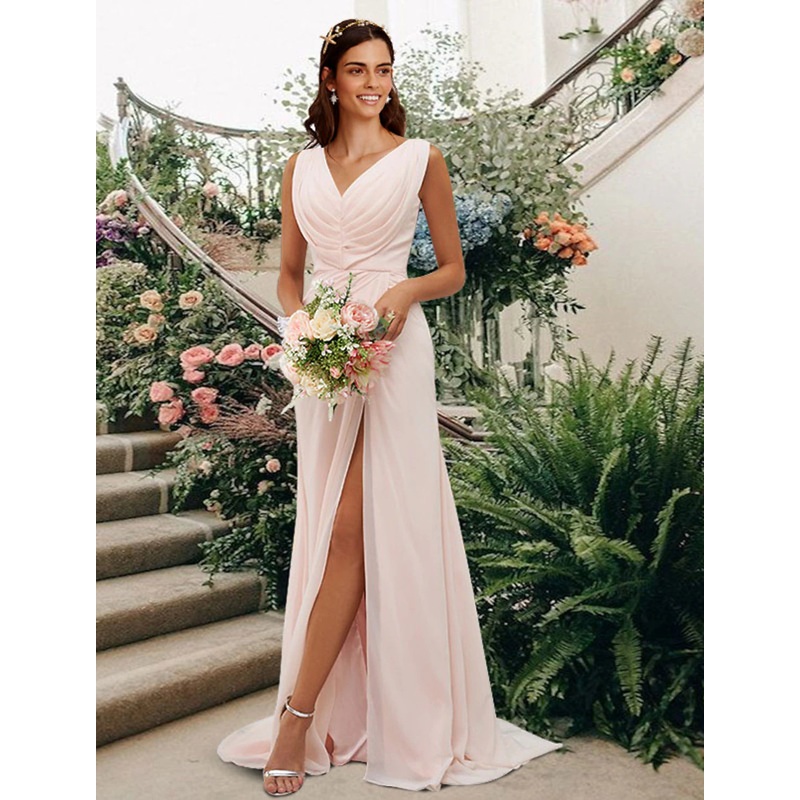 A-Line Bridesmaid Dress V Neck Sleeveless Elegant Floor Length Chiffon with Split Front / Ruching