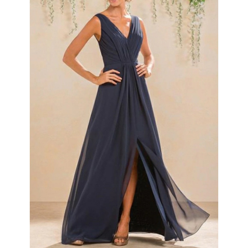 A-Line Bridesmaid Dress V Neck Sleeveless Open Back Floor Length Chiffon with Pleats / Split Front