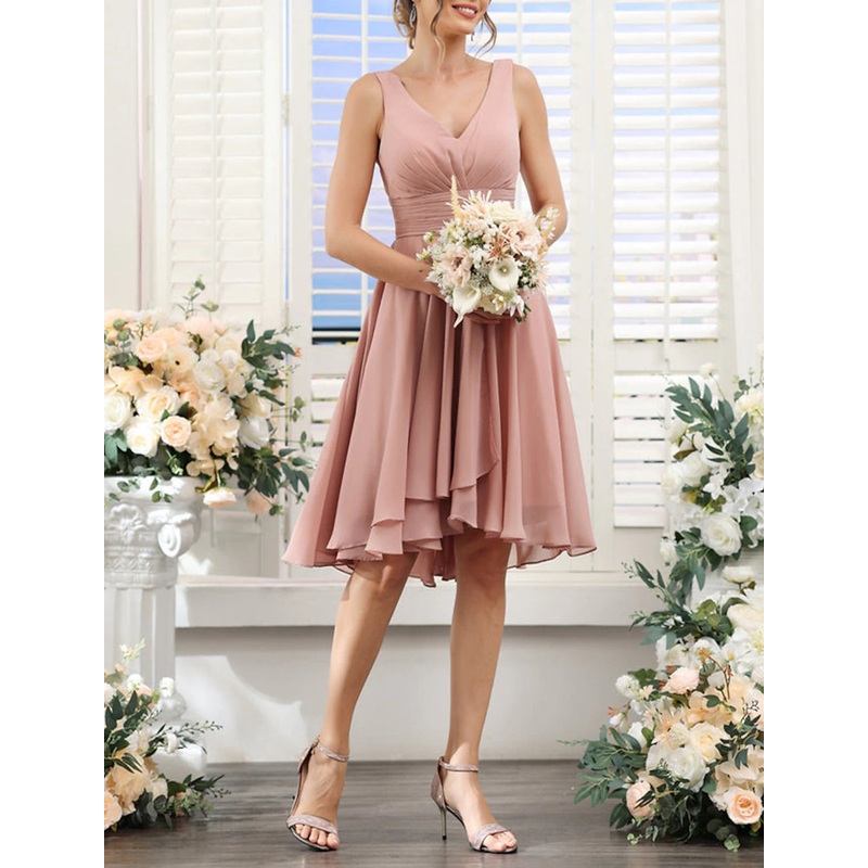 A-Line Bridesmaid Dress V Neck Sleeveless Pink Knee Length Chiffon with Ruching / Solid Color
