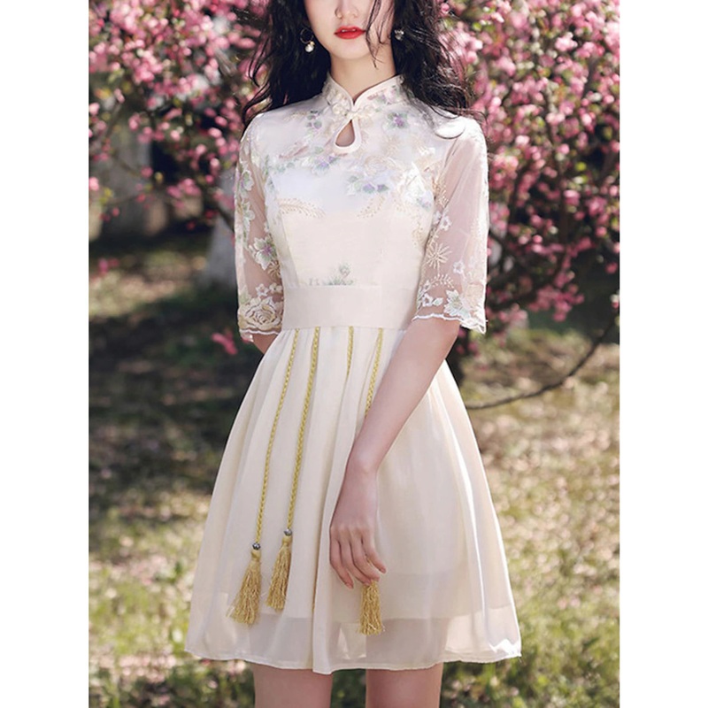 Be the first to review “A-Line Chinese Style Elegant Graduation Prom Dress Stand Collar Half Sleeve Short / Mini Chiffon with Tassel Embroidery” Cancel reply