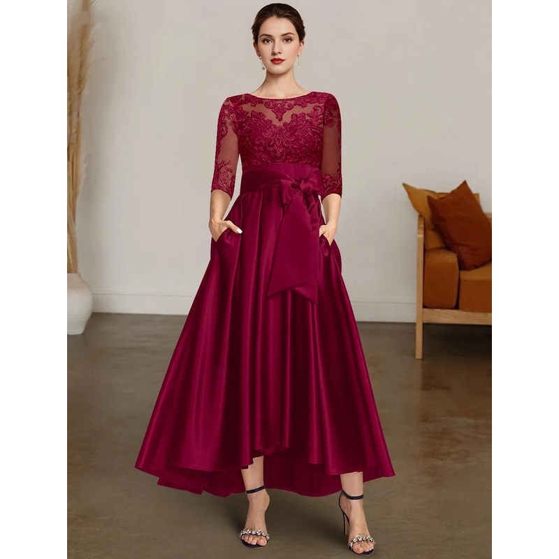 A-line Christmas dress bride’s mother’s dress formal wedding guests elegant high-low boat collar asymmetrical satin lace 3/4 long sleeves with lace belt/ribbon 2025