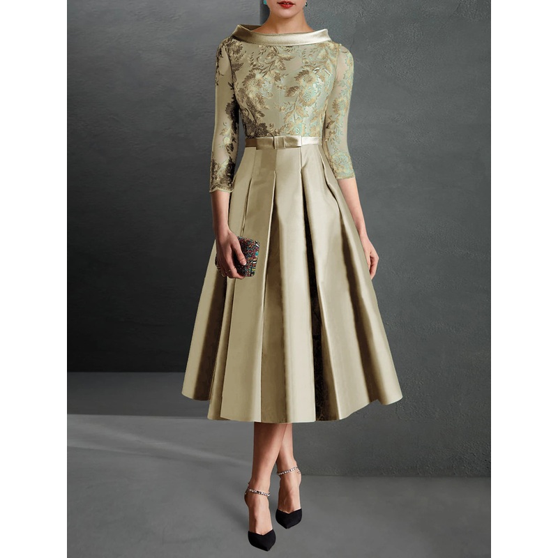A-Line Cocktail Dress Christmas Red Green Dresses Formal Kentucky Derby Tea Length 3/4 Length Sleeve Jewel Neck Fall Wedding Guest Satin with Pleats Appliques 2025
