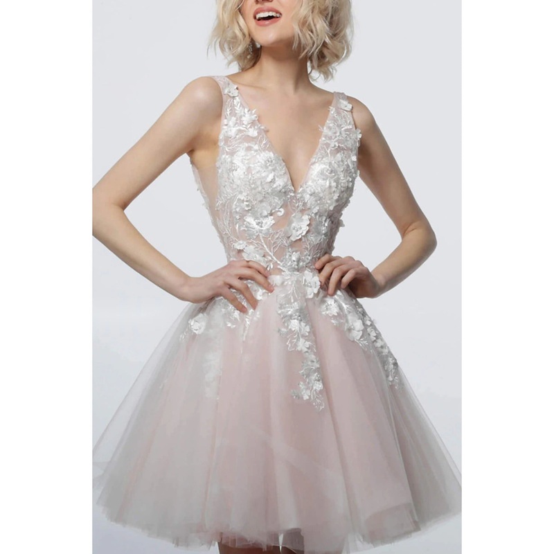 A-Line Cocktail Dresses Cute Dress Graduation Quinceanera Short / Mini Sleeveless V Neck Tulle with Appliques