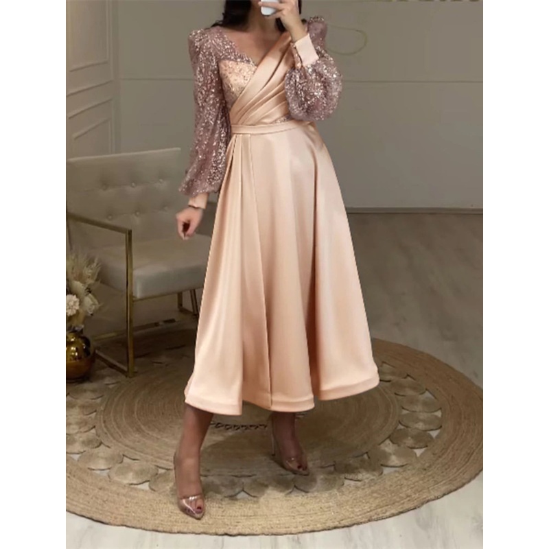 A-Line Cocktail Dresses Elegant Dress Party Wear Wedding Guest Tea Length Long Sleeve V Neck Fall Wedding Guest Satin with Ruched