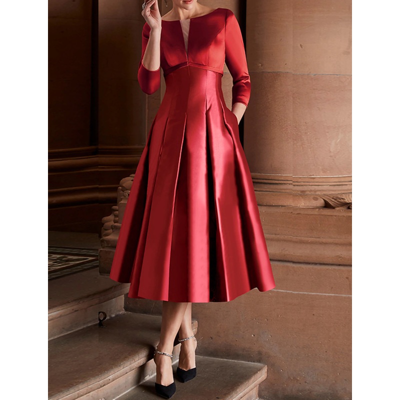 A-Line Cocktail Dresses Minimalist Dress Christmas Red Green Dress Wedding Guest Tea Length 3/4 Length Sleeve Jewel Neck Fall Wedding Guest Satin with Pleats 2025