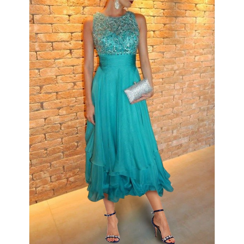 A-Line Cocktail Dresses Tiered Plisse Dress Wedding Guest Kentucky Derby Ankle Length Sleeveless Jewel Neck Fall Wedding Guest Chiffon with Sequin Appliques
