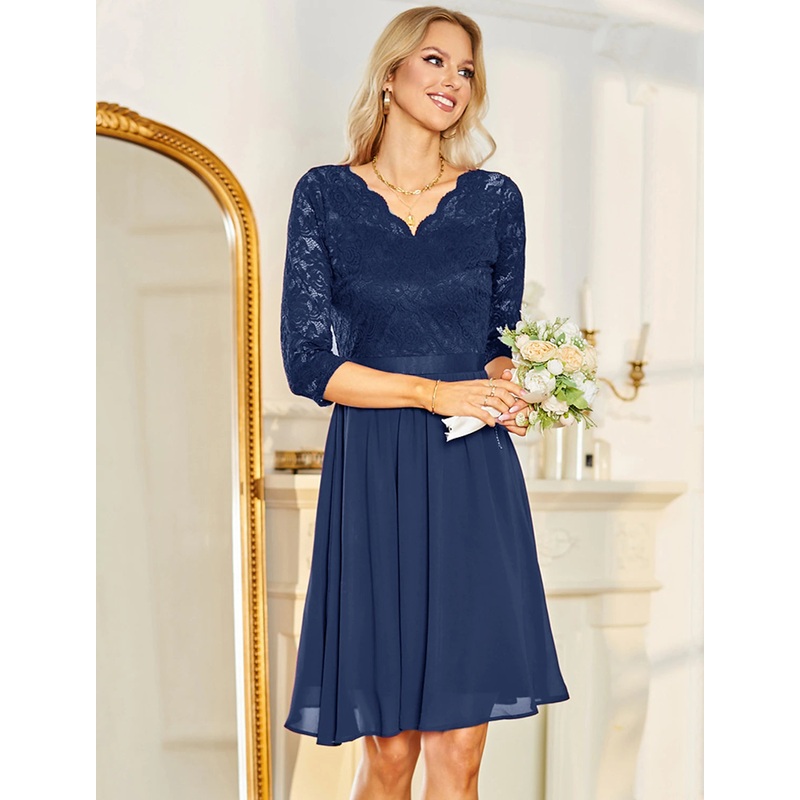 A-Line Cocktail Dresses Vintage Dress Wedding Guest Party Wear Knee Length Half Sleeve V Neck Chiffon with Pleats