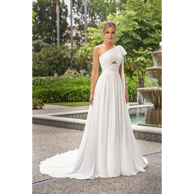 A-line crepe low round neck exquisite thin shoulder strap and floor length wedding dress