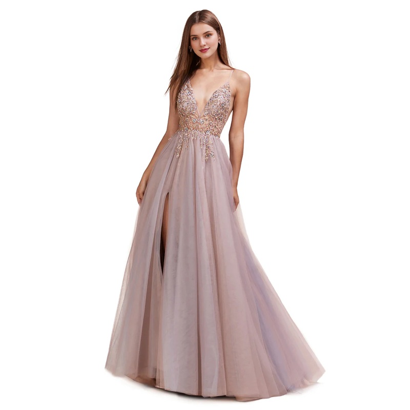 A-line deep V-neck embroidered chiffon thin shoulder strap chiffon prom dress