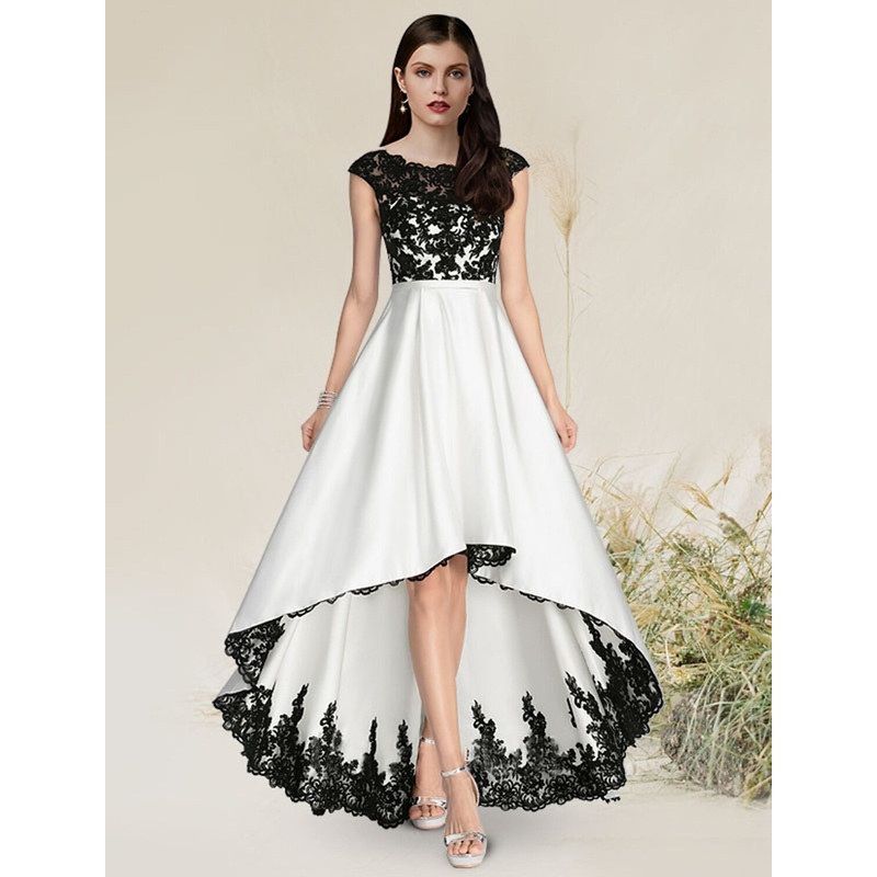 A-Line Elegant Engagement Formal Evening Dress Jewel Neck Sleeveless Asymmetrical Satin with Appliques