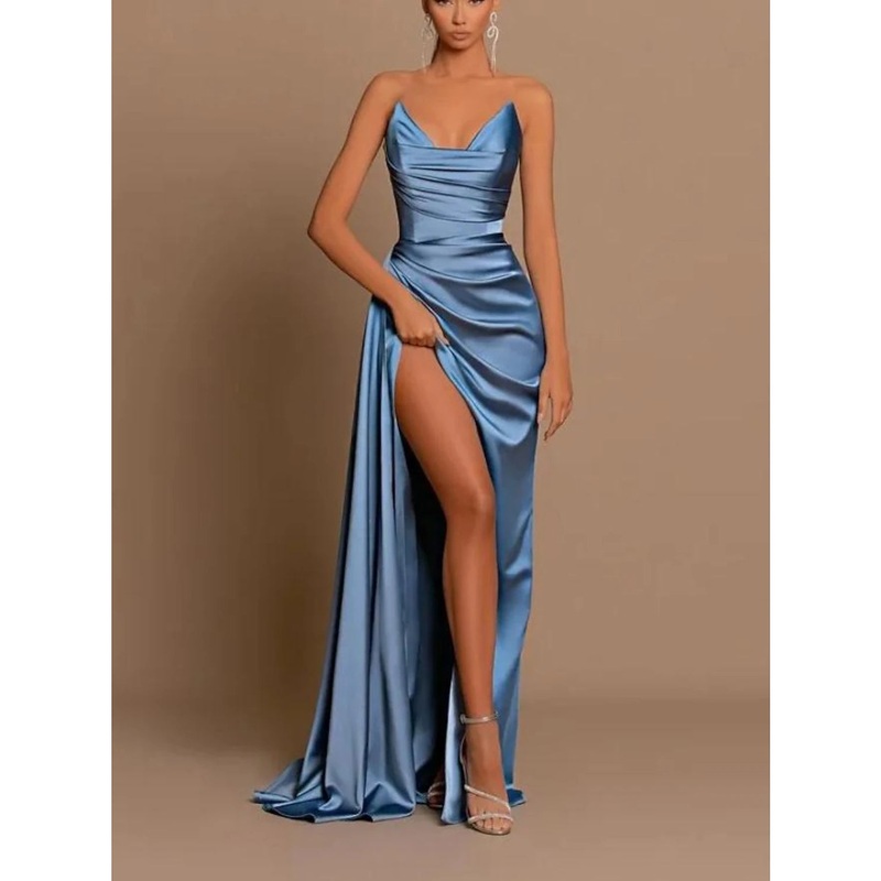 A-Line Evening Dress Blue Wedding Guest Dress Cocktail Party Dress Satin Sweep / Brush Train Sleeveless V Neck Bridesmaid Dress Backless with Pleats Ruched Slit