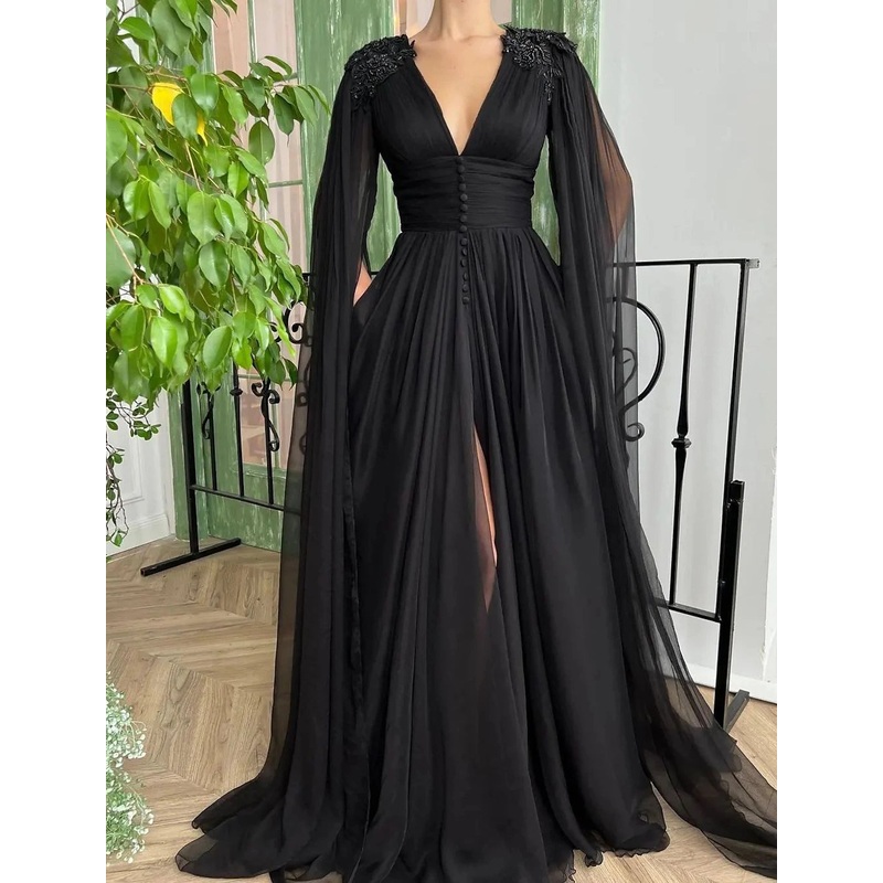 A-Line Evening Gown Black Dress Plus Size Formal Masquerade Court Train Long Sleeve V Neck Wednesday Addams Family Chiffon with Buttons Slit Appliques 2025