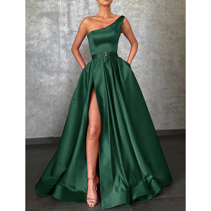 A-Line Evening Gown Celebrity Style Dress Christmas Red Green Dress Formal Wedding Sweep / Brush Train Sleeveless One Shoulder Belt / Sash Satin with Pleats Slit