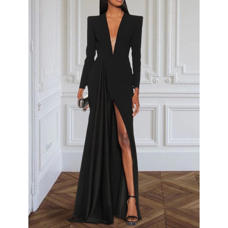 Be the first to review “A-Line Evening Gown Elegant Black Champagne Dress Plus Size Dress Formal Sweep / Brush Train Long Sleeve V Neck Fabric with Pleats Slit” Cancel reply