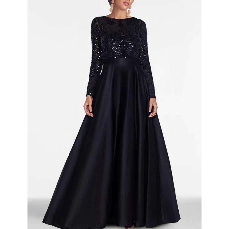 A-Line Evening Gown Elegant Black Dress Plus Size Formal Sequin Satin Dress Black Tie Floor Length Long Sleeve Off Shoulder Fall Wedding Guest with Slit Pocket 2025