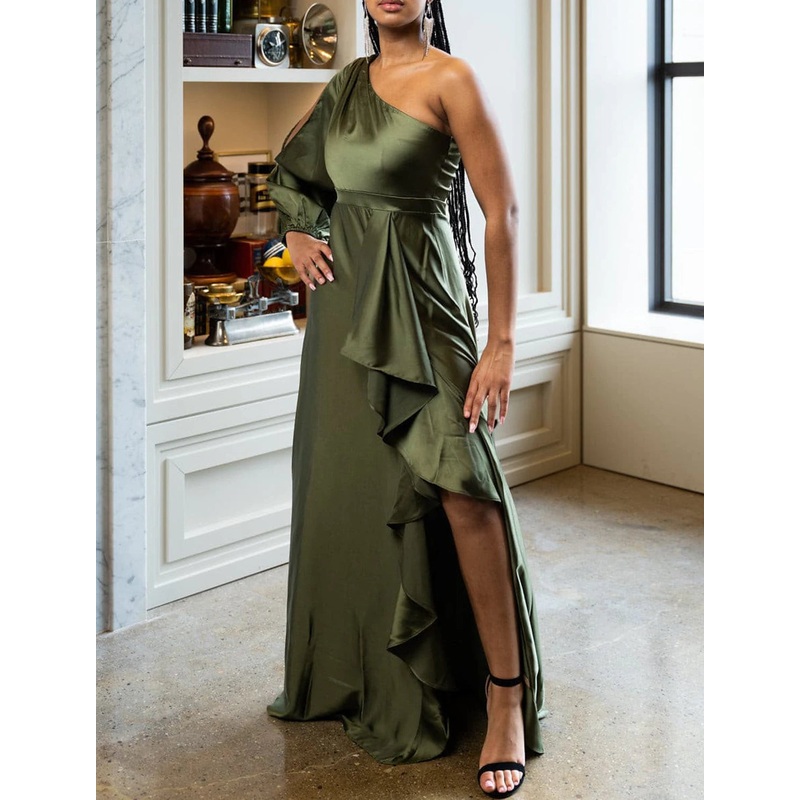 A-Line Evening Gown Elegant Dress Formal Christmas Sweep / Brush Train Long Sleeve One Shoulder Satin with Ruched Ruffles