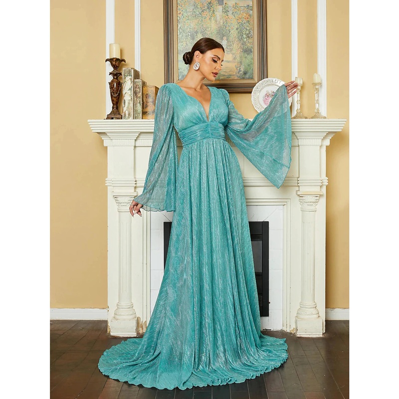 A-Line Evening Gown Elegant Dress Formal Court Train Long Sleeve V Neck Sequined with Glitter Pleats