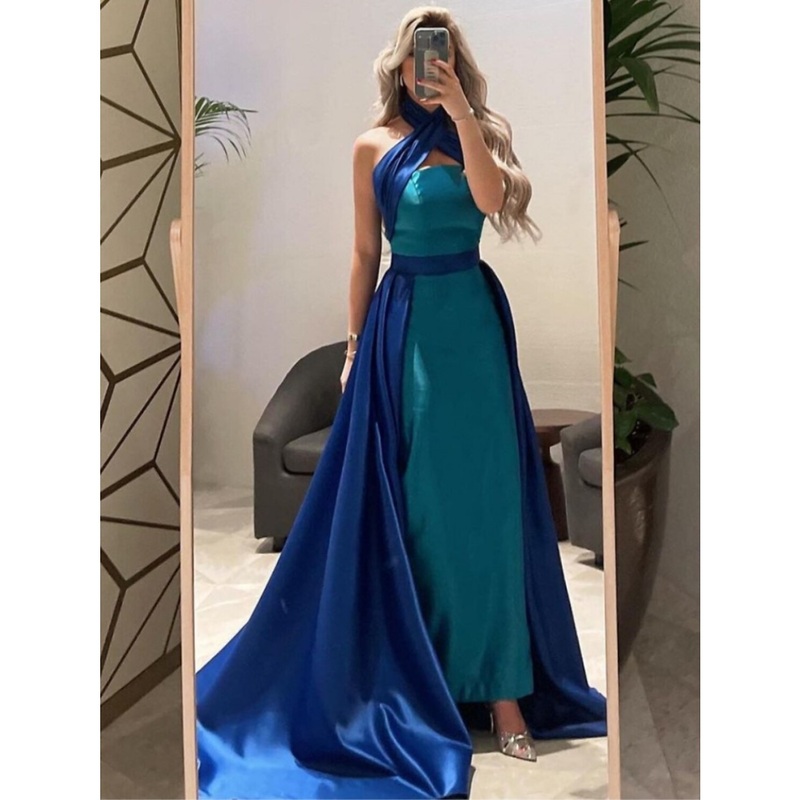 Be the first to review “A-Line Evening Gown Elegant Dress Formal Court Train Sleeveless Halter Neck Satin with Pleats”