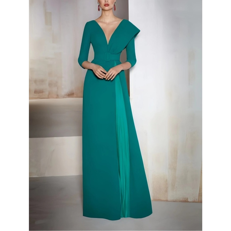 A-Line Evening Gown Elegant Dress Formal Fall Sweep / Brush Train 3/4 Length Sleeve V Neck Fabric with Pleats 2025