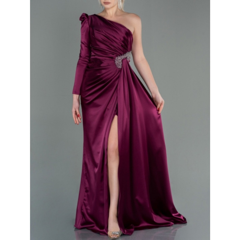 A-Line Evening Gown Elegant Dress Formal Fall Sweep / Brush Train Long Sleeve One Shoulder Satin with Ruched Sequin Slit 2025