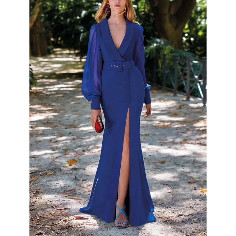 A-Line Evening Gown Elegant Dress Formal Fall Sweep / Brush Train Long Sleeve V Neck Fabric with Buttons Slit