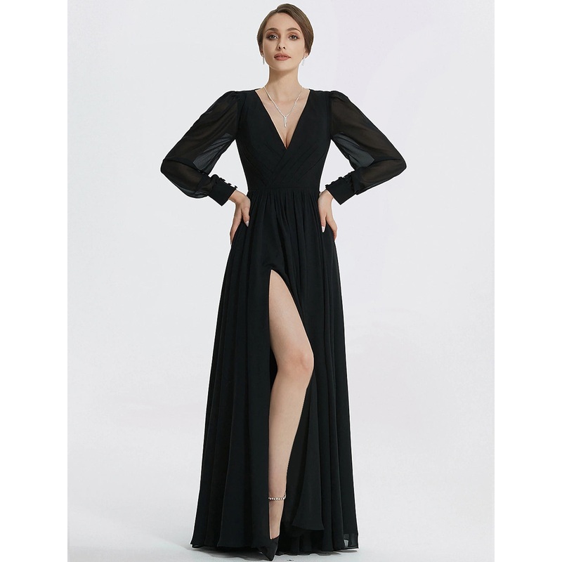 A-Line Evening Gown Elegant Dress Formal Floor Length Long Sleeve V Neck Chiffon with Slit