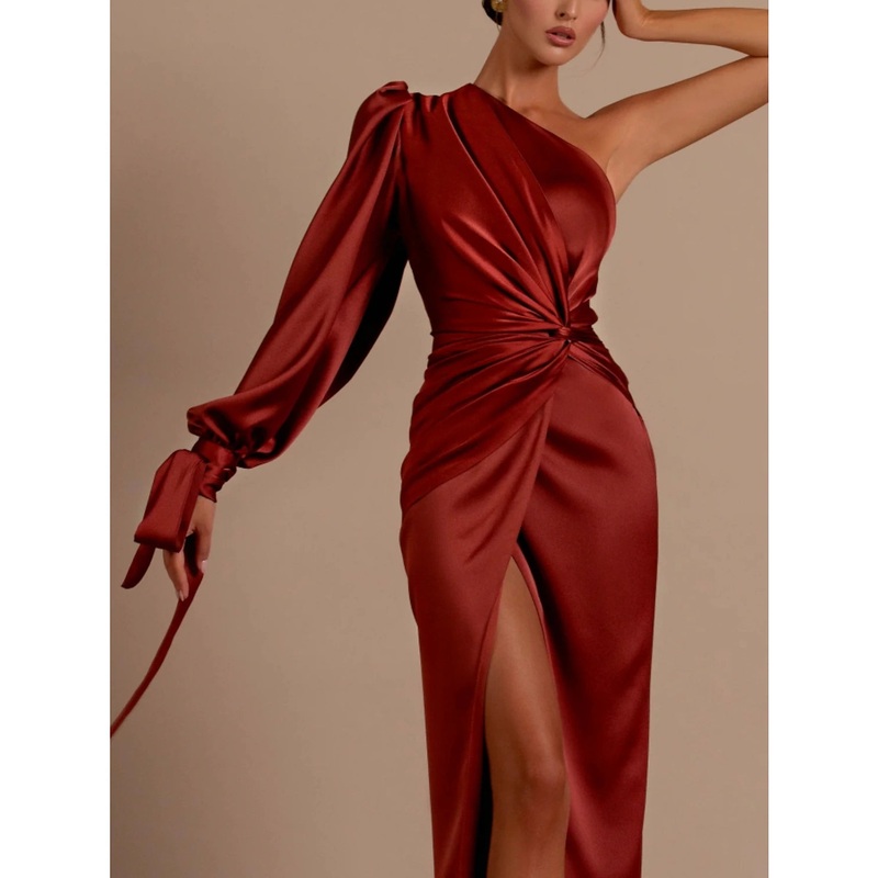 Be the first to review “A-Line Evening Gown Elegant Dress Formal Sweep / Brush Christmas Red Green Dress Train Long Sleeve One Shoulder Satin with Feather Ruched Strappy 2025”