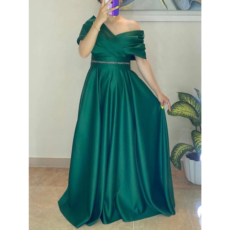 A-Line Evening Gown Elegant Dress Formal Sweep / Brush Train Christmas Red Green Dress Short Sleeve Off Shoulder Satin with Pleats Crystals