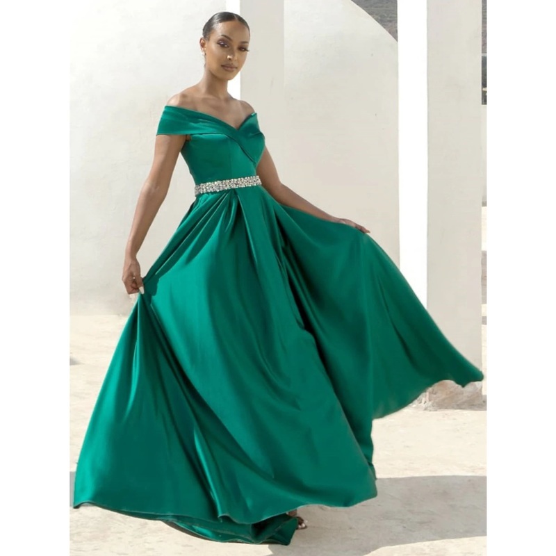 A-Line Evening Gown Elegant Dress Formal Sweep / Brush Train Christmas Red Green Dress Sleeveless Off Shoulder Satin with Pleats Crystals
