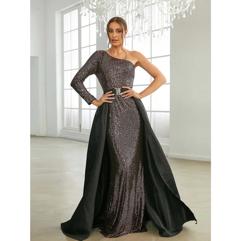 A-Line Evening Gown Elegant Dress Formal Sweep / Brush Train Long Sleeve One Shoulder Sequined with Glitter Pleats