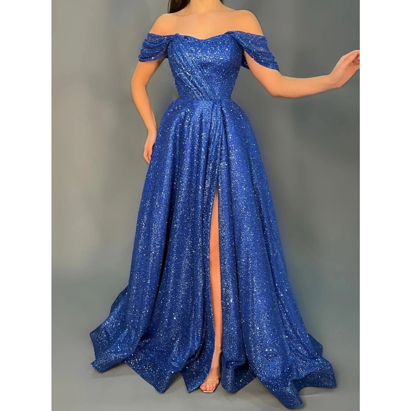 A-Line Evening Gown Elegant Dress Formal Sweep / Brush Train Short Sleeve Off Shoulder Lurex Fabric with Glitter Pleats Slit 2025