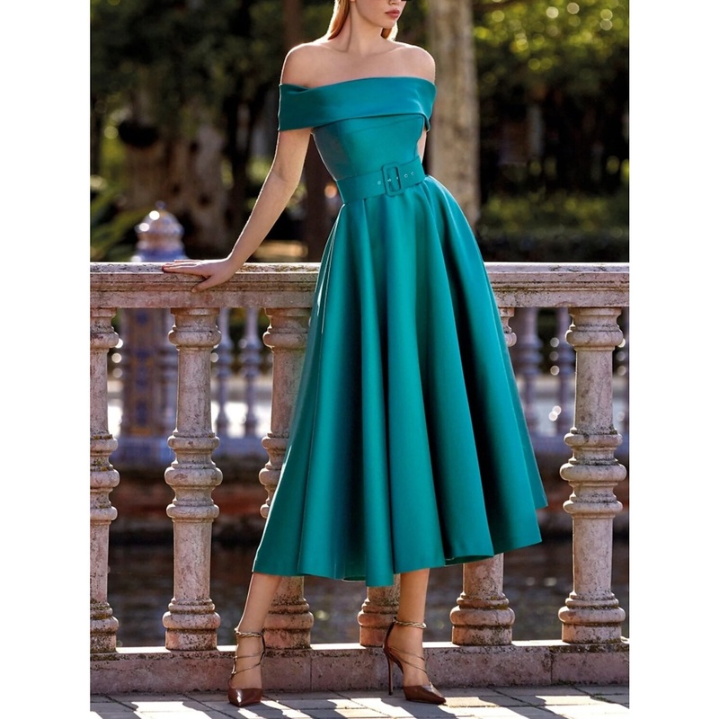 A-Line Evening Gown Elegant Dress Formal Tea Length Short Sleeve Off Shoulder Satin with Pleats Strappy