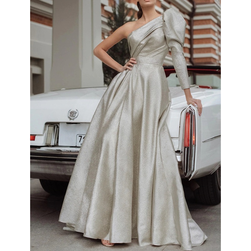 Be the first to review “A-Line Evening Gown Elegant Dress Formal Wedding Guest Floor Length Long Sleeve One Shoulder Sequined with Pleats” Cancel reply