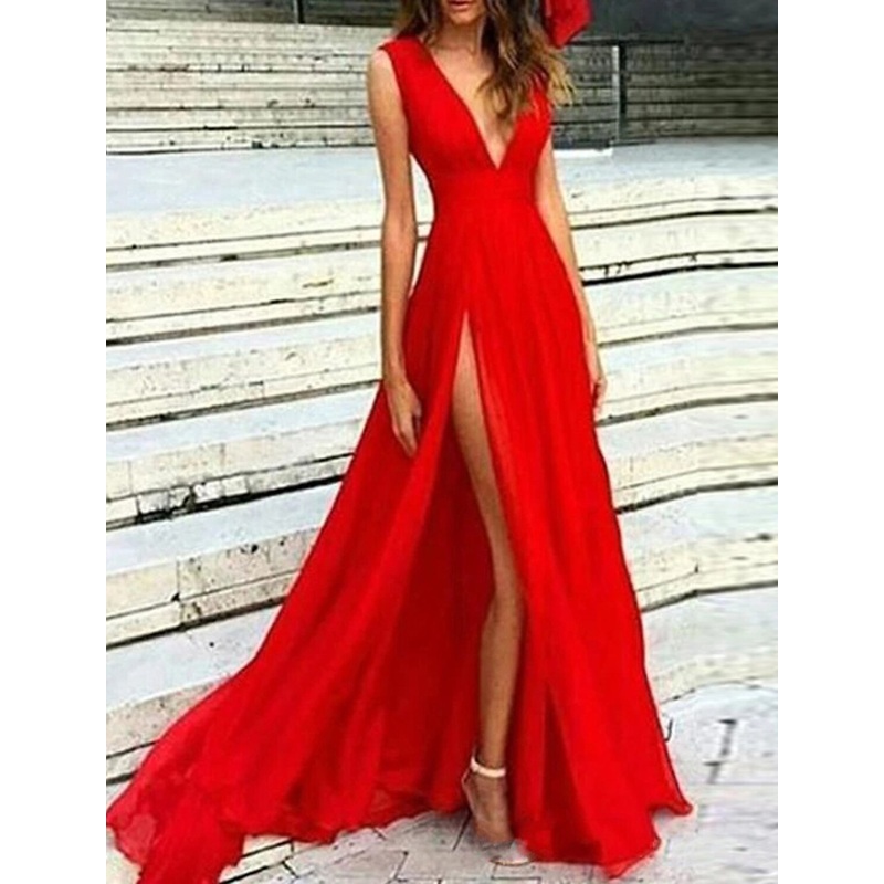 A-Line Evening Gown Elegant Dress Party Wear Wedding Guest Floor Length Sleeveless V Neck Chiffon with Slit