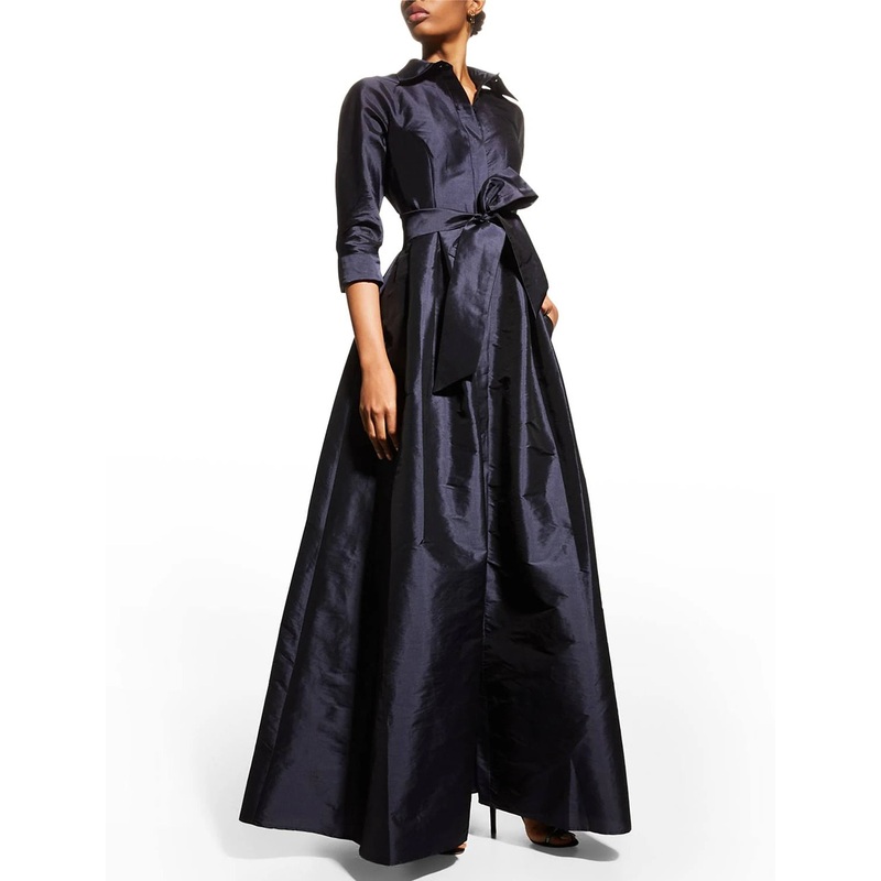 A-Line Evening Gown Elegant Dress Wedding Guest Floor Length 3/4 Length Sleeve Shirt Collar Pocket Taffeta with Pocket Strappy
