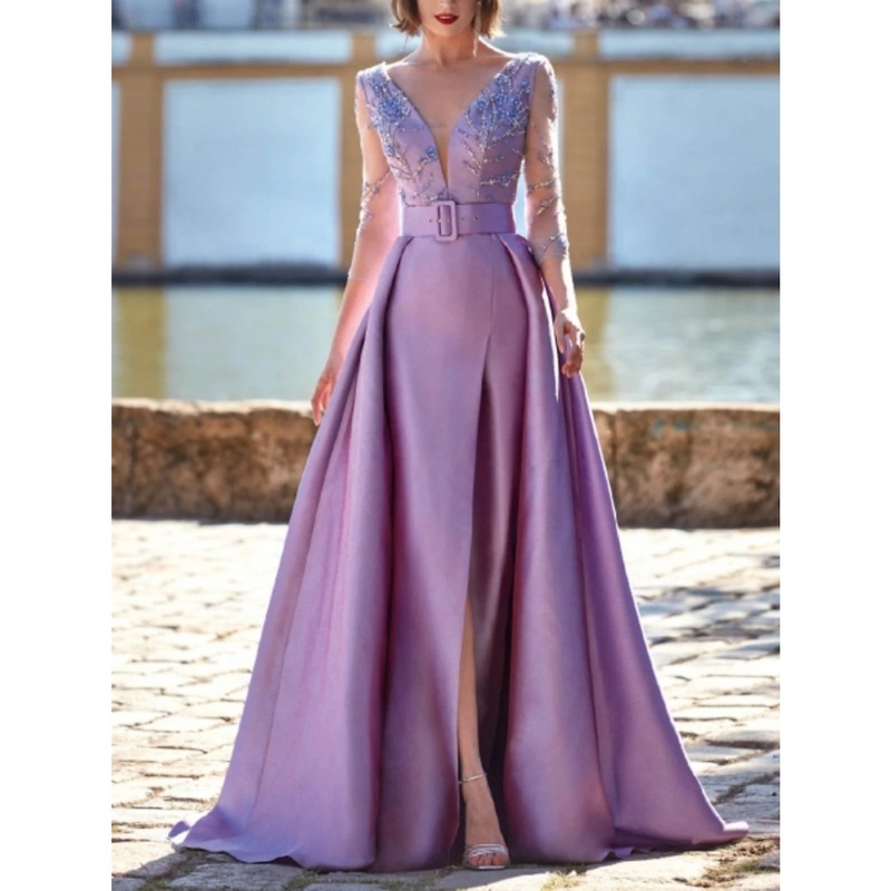 A-Line Evening Gown Elegant Dress Wedding Guest Sweep / Brush Train 3/4 Length Sleeve V Neck Satin with Pleats Sequin Slit