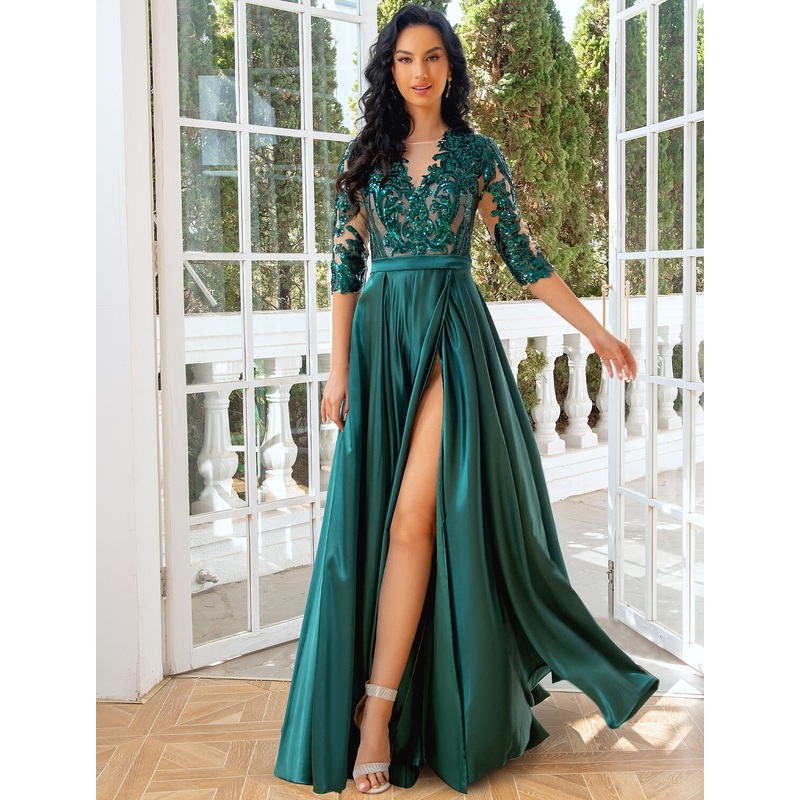 Be the first to review “A-Line Evening Gown Elegant Dress Wedding Party Floor Length Half Sleeve Illusion Neck Satin with Pleats Sequin Slit”