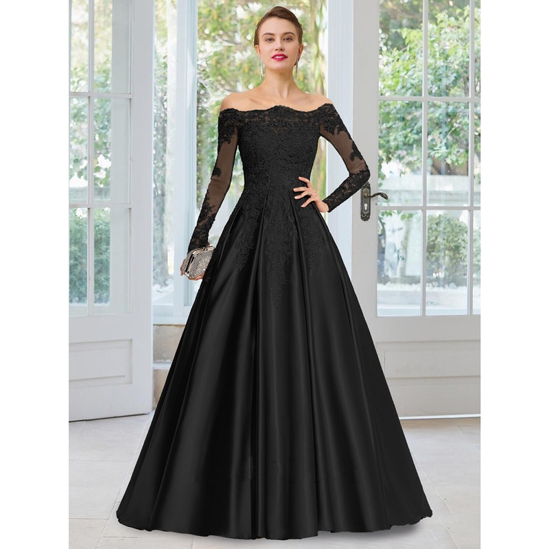 A-Line Evening Gown Floral Dress Formal Black Dress Court Train Long Sleeve Off Shoulder Lace with Appliques
