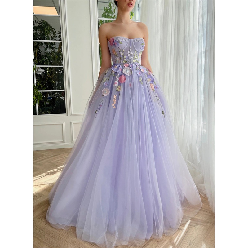 A-Line Evening Gown Floral Dress Wedding Court Train Sleeveless Strapless Tulle with Appliques