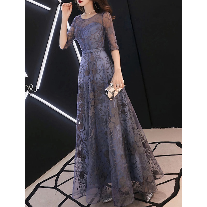 A-Line Evening Gown Floral Dress Wedding Guest Formal Evening Floor Length Half Sleeve Jewel Neck Tulle with Embroidery Pattern / Print 2025