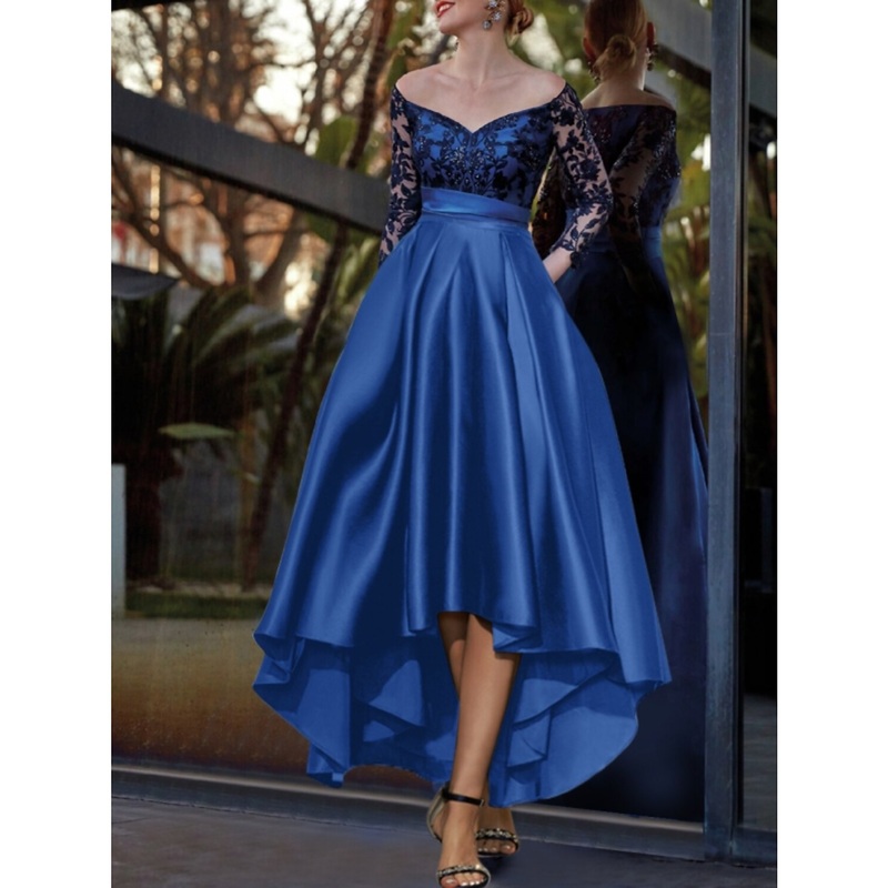 Be the first to review “A-Line Evening Gown Glittering Dress Formal Wedding Guest Asymmetrical Long Sleeve Off Shoulder Satin with Pleats Sequin” Cancel reply