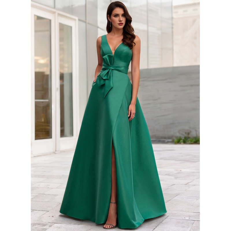 A-line evening gown high slit dress formal makeup ball and floor length sleeveless V-neck belt/waistband ribbon bow slit 2025 gods evening dresses