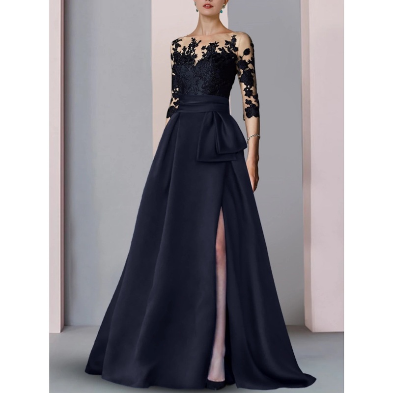 A-Line Evening Gown High Split Dress Formal Fall Sweep / Brush Train Half Sleeve Illusion Neck Satin with Slit Embroidery