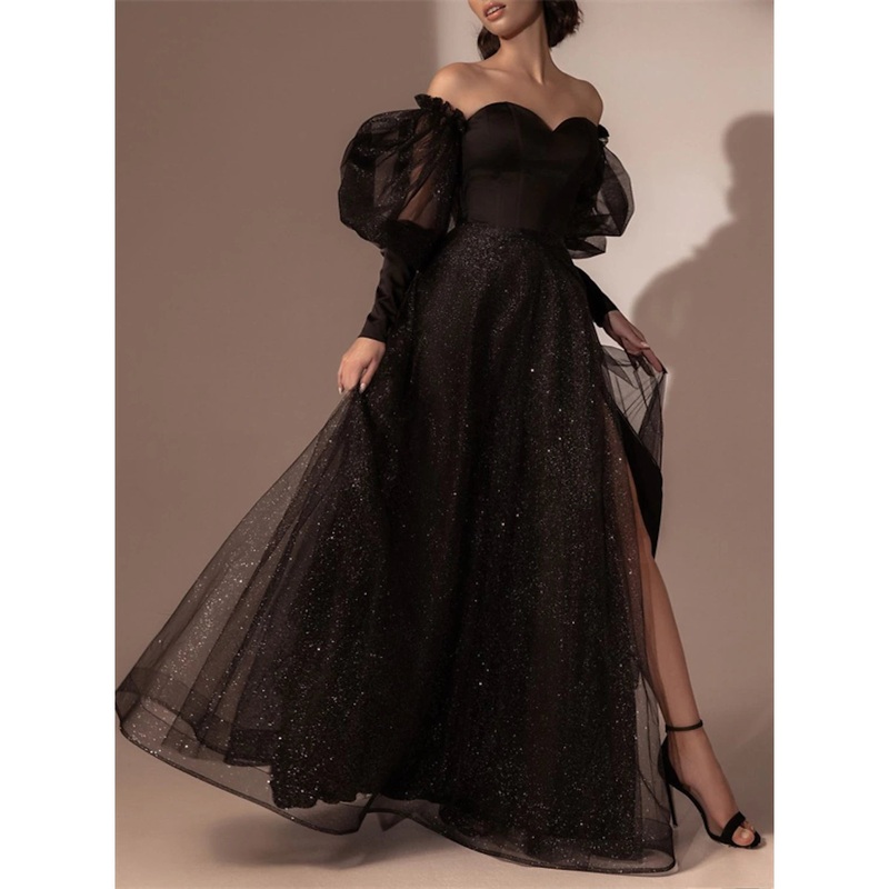 A-Line Evening Gown High Split Dress Prom Semi Formal Black Dress Plus Size Floor Length Long Sleeve Off Shoulder Tulle with Glitter Slit