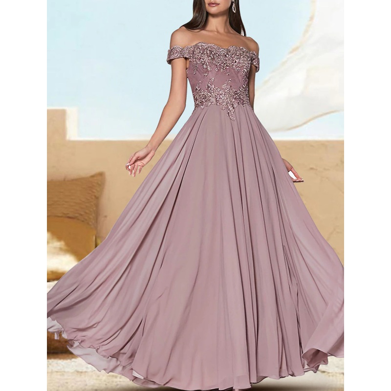 A-Line Evening Gown Luxurious Dress Formal Wedding Guest Floor Length Short Sleeve Off Shoulder Chiffon with Appliques Pure Color 2025