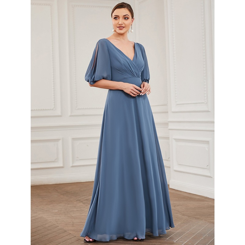 A-Line Evening Gown Minimalist Dress Wedding Guest Prom Floor Length Half Sleeve V Neck Chiffon with Pleats